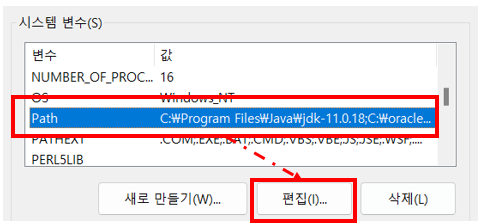 시스템 변수 중 path 변수를 클릭 후 '편집' 클릭