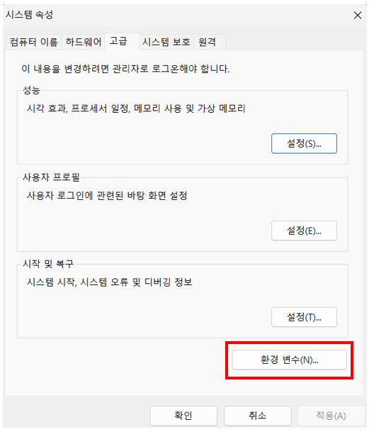 '환경변수' 버튼 클릭