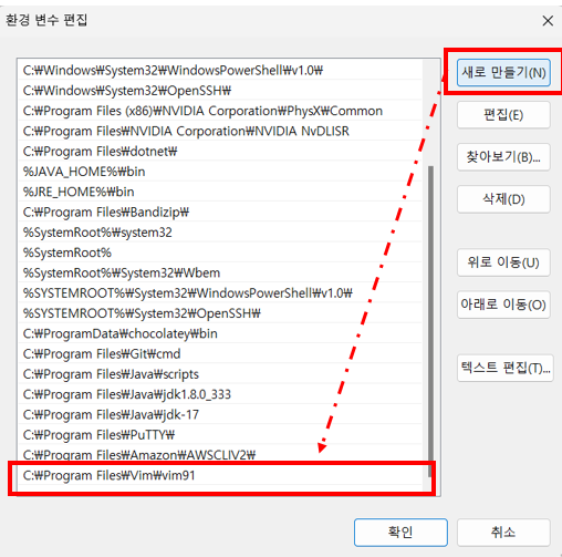 '새로 만들기' 버튼 클릭. vim 이 설치된 경로 입력 후 '확인' 버튼 클릭