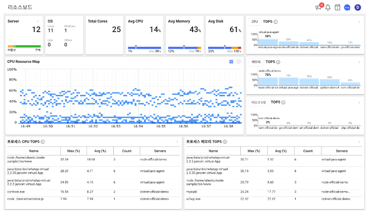 - 데이터 시각화 및 분석: 강력한 시각화 도구를 사용하여 리소스 및 애플리케이션 데이터를 수집, 액세스 및 분석