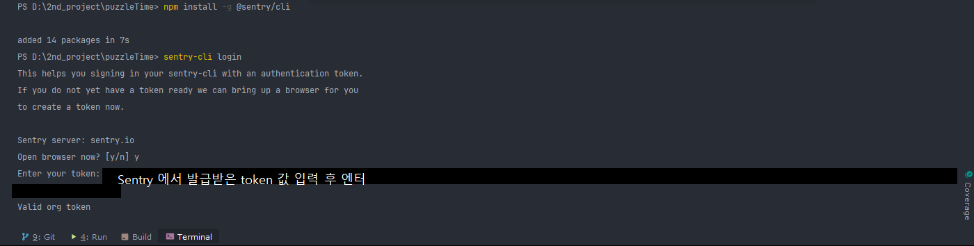 4. Enter your token 에 sentry 에서 발급 받은 token 값을 입력
